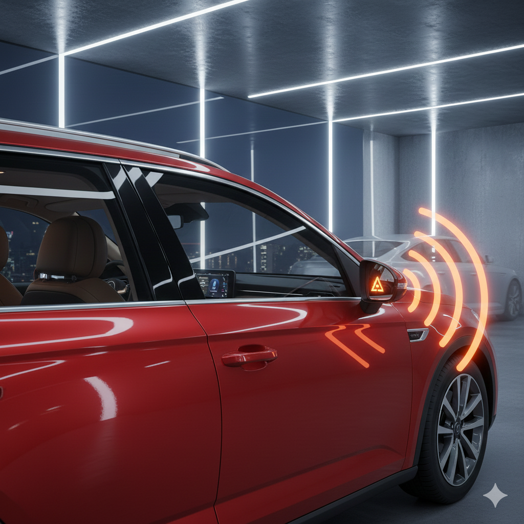 • هشدار باز شدن درب (Door Opening Warning – DOW): این ویژگی به‌ویژه برای سرنشینان عقب بسیار حیاتی است. سیستم با استفاده از سنسورها، نزدیک شدن دوچرخه، موتورسیکلت یا خودرو را از پشت تشخیص می‌دهد و اگر سرنشین قصد باز کردن درب را داشته باشد، هشدار می‌دهد تا از تصادف جلوگیری شود (اغلب در خودروهایی مثل آئودی و فولکس واگن).